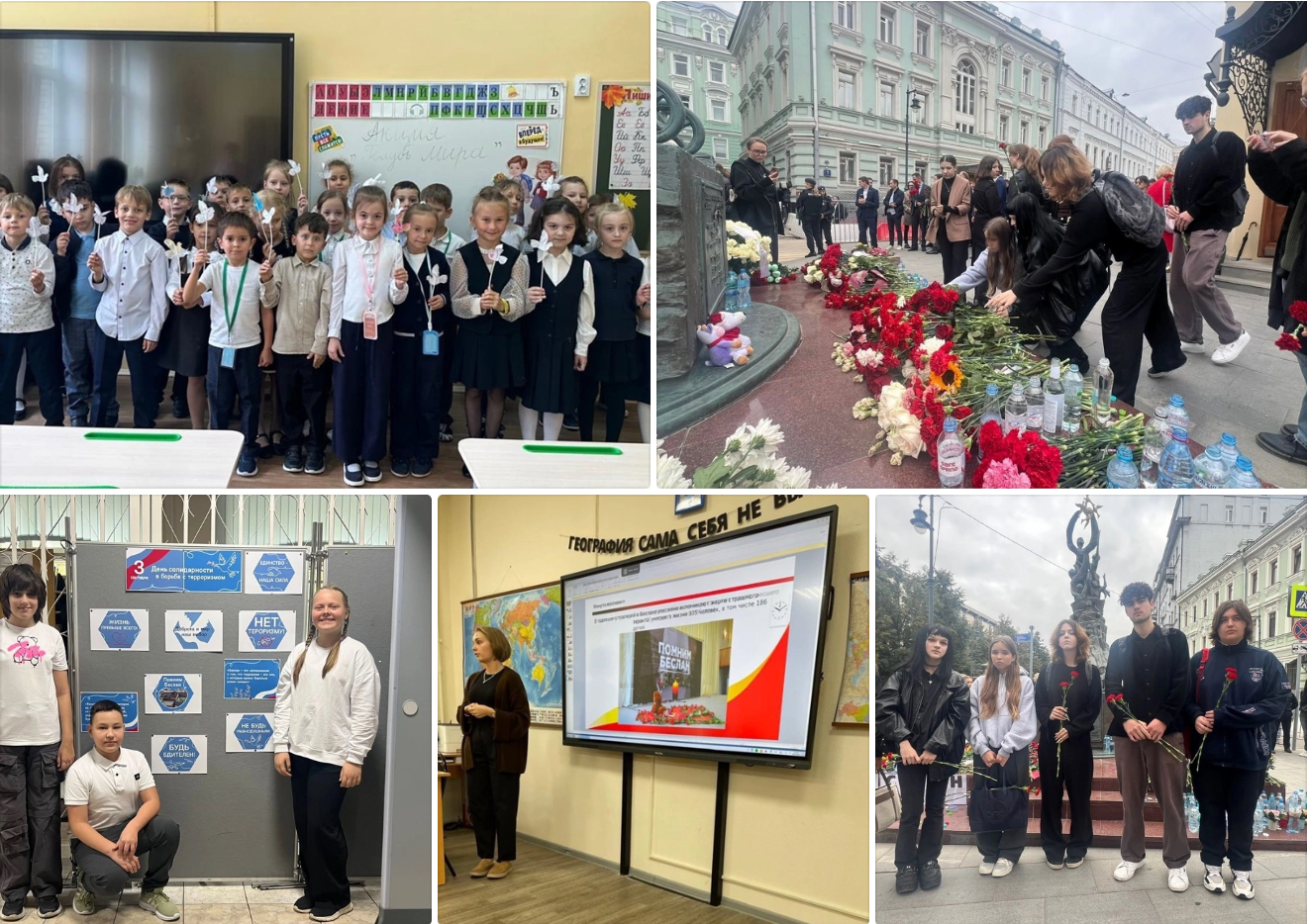 В школе 1550 прошли памятные мероприятия ко Дню солидарности в борьбе с терроризмом. Учащиеся возложили цветы к монументу жертвам Беслана на Китай-городе, оформили информационный мемориальный стенд, а для старшеклассников провели «Уроки мужества». Младшие классы присоединились к акции «Голубь мира», изготовив бумажных голубей. Мы помним и скорбим.