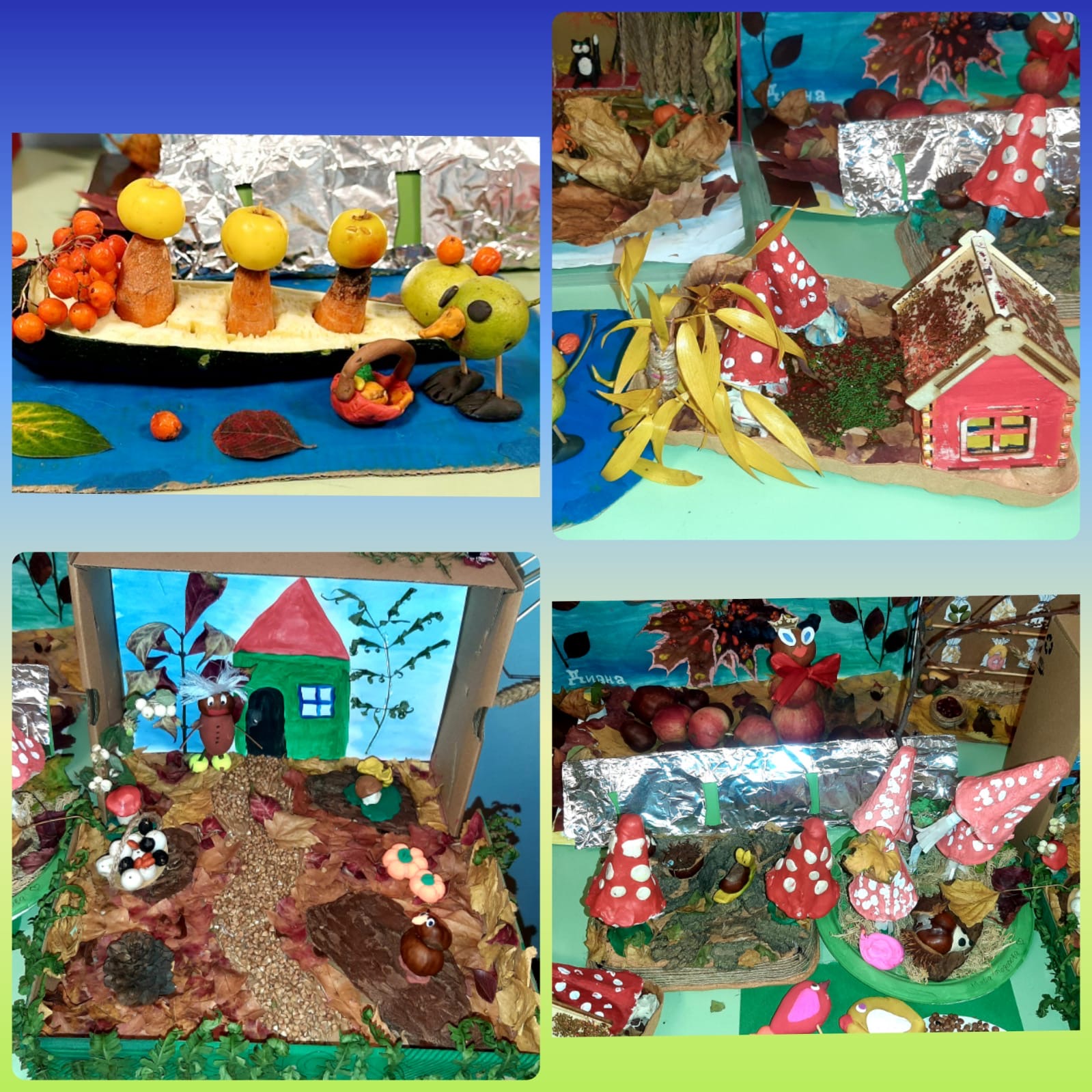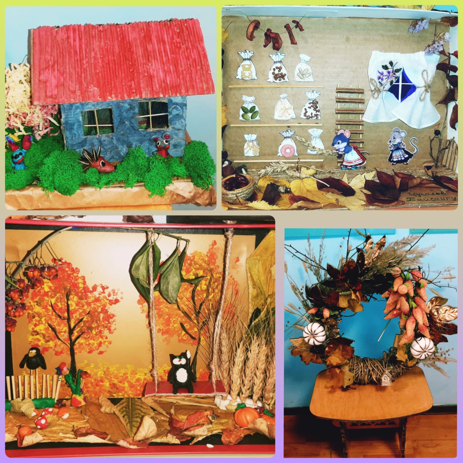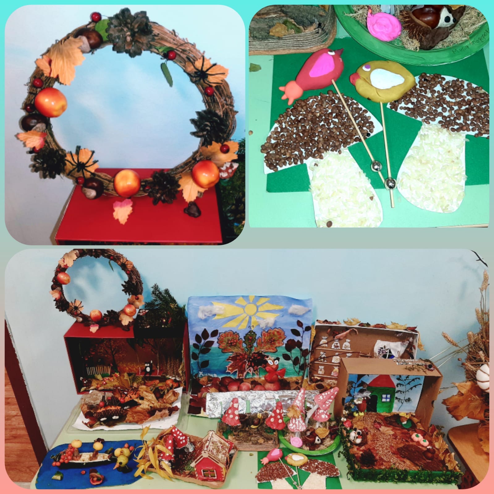 На выставке были представлены интересные поделки из шишек и желудей, листьев и веток, засушенных цветов и травы. Дети совместно с родителями смастерили забавные домики, очаровательные осенние букеты и веночки, целые осенние композиции. В результате получились оригинальные поделки.