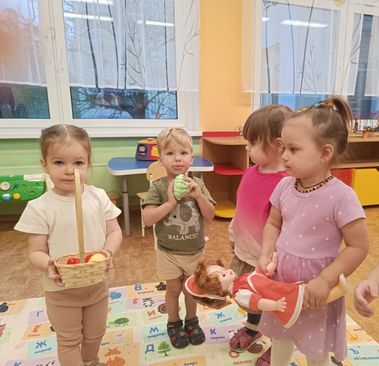 Малыши с удовольствием познакомились и угостили гостей из сказки фруктами.