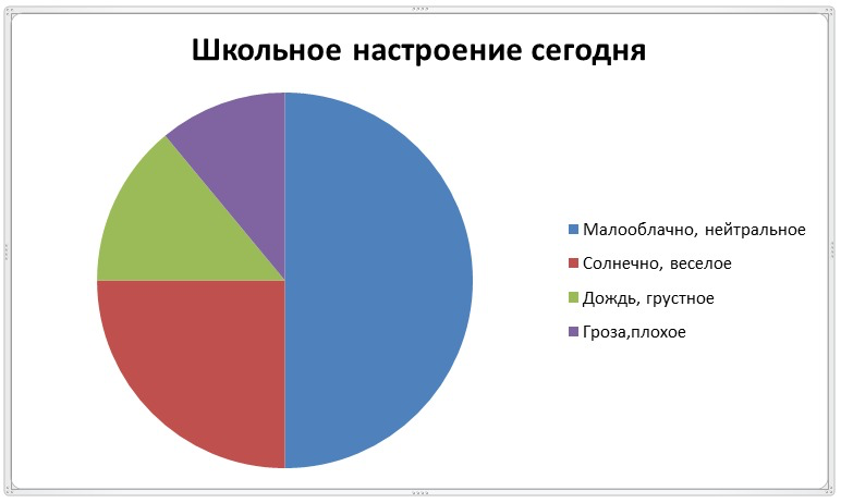 Сегодня мы узнали общешкольное настроение. Несмотря на отсутствие солнышка на улице, у четверти ребят оно веселое, а у половины нейтральное.