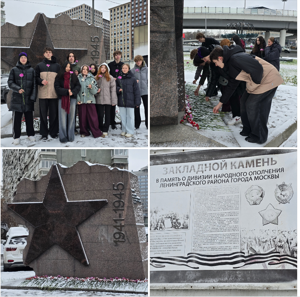 Ученики 10 -2 класса возложили цветы у памятника 18-й бригаде Народного Ополчения, которая формировалась здесь в 1941 году на Ленинградском проспекте.